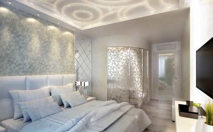 Отличное решение — спроектировать потолок с большим количеством уровней, разрисованных серебряными или золотистыми красками. Для большего эффекта создается подсветка.