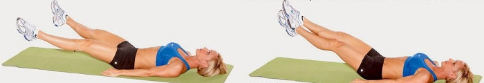 Напрягите пресс, медленно оторвите бедра от пола на 2-3 см, не меняя угол наклона ног, задержитесь на два счета, медленно вернитесь в исходное положение. Вдох - внизу, выдох - вверху, во время подъема бедер. Повторите 10 раз. Опустите ноги, потянитесь, расслабьтесь, глубоко подышите, и снова повторите 10 раз. Следите, чтобы спина оставалась прижатой к полу во время упражнения.