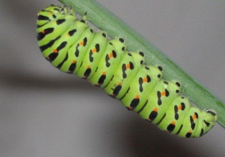 Спустя 7 дней из яйца вылупляется гусеница махаона – очень яркая и очень прожорливая, за сутки может съесть грядку укропа.