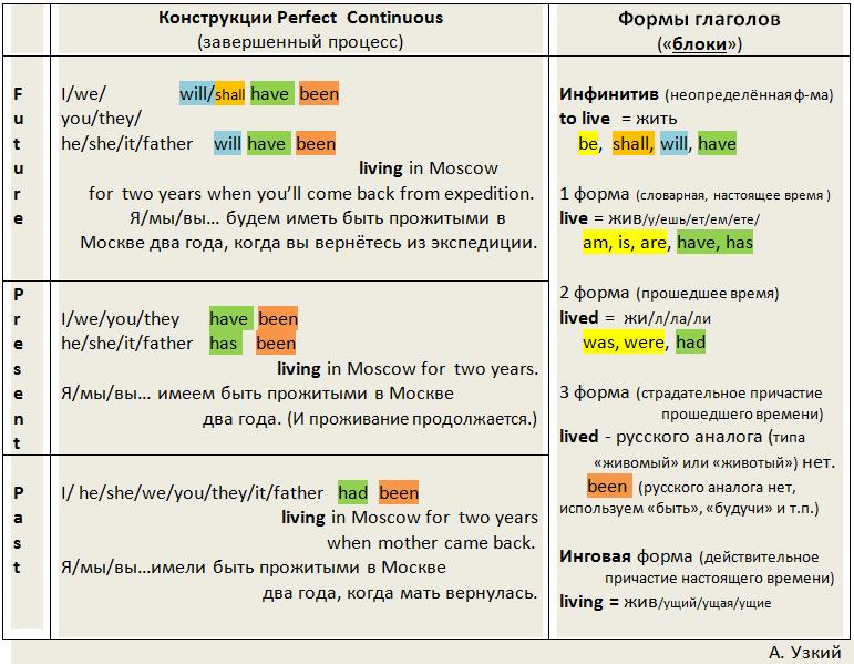 Конструкции Perfect Continuous (завершенный процесс) более громоздки, но тоже вполне стандартны и универсальны. Процесс в них отображается инговой формой смыслового глагола, для отображения завершенности служит третья форма глагола to be (been), а время действия и пр. передаётся соответствующей формой вспомогательного глагола to have, в меру его возможностей.