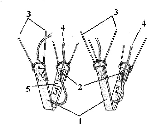 Стропы управления: 1 - свободные концы подвесной системы; 2 - кольца; 3 - основные стропы; 4 - стропы управления; 5 - шлевка резиновая