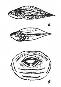 Внешний вид (а) и ротовой диск (б) головастика