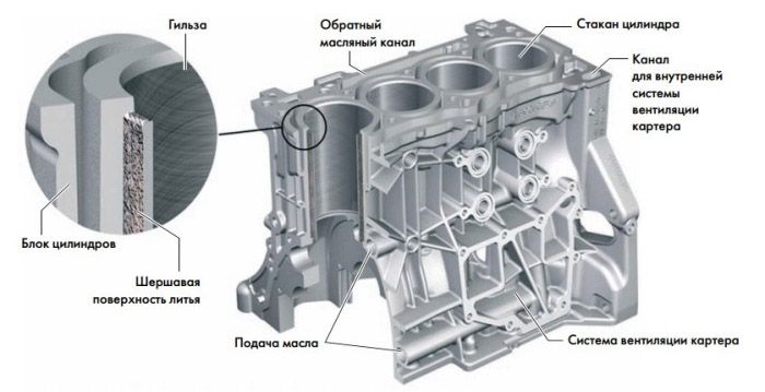 Блок цилиндров у новых двигателей изготовлен из алюминия методом литья под давлением и выполнен с открытой рубашкой охлаждения, технология «Open Deck». Блок цилиндров отлит с предварительно установленными отдельными гильзами цилиндров из серого чугуна. Их наружная поверхность шероховатая, благодаря чему площадь поверхности увеличивается, и теплопередача к блоку цилиндров улучшается. Кроме того, это обеспечивает качественное соединение с геометрическим замыканием между блоком цилиндров и гильзой цилиндра.