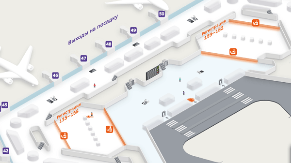 - на 2 этаже расположены стойки регистрации с 135 по 182;