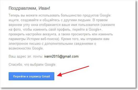 Все готово! Сервис поздравит нас с регистрацией и предложит перейти в свой почтовый ящик. Нажимаем “Перейти к сервису Gmail” .