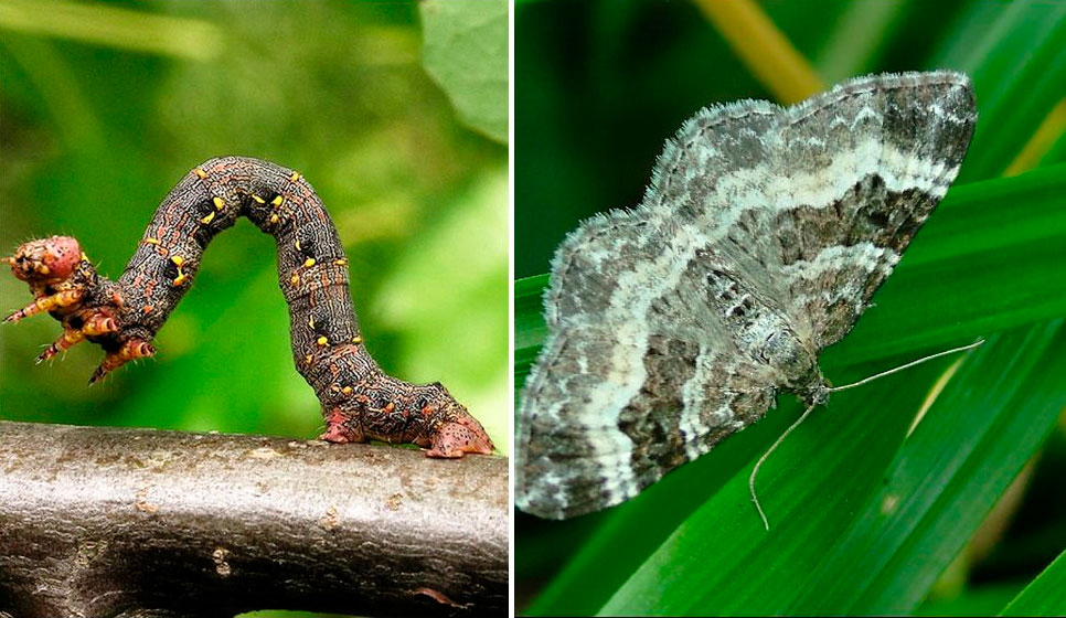 Эту гусеницу еще называют землемером, из-за оригинального способа передвижения. Это связано с недоразвитостью передних ложных ног. Благодаря своей коричневой окраске, ей удается надежно маскироваться среди растительности. Кроме этого, благодаря развитой мышечной системе, гусеница может подолгу находиться в вытянутом неподвижном состоянии, изображая обломанную веточку или сучок. Этот вид гусеницы питается хвоей деревьев, листвой смородины, орешником и т.д. Бабочка пяденицы отличается тонким вытянутым телом и широкими нежными крыльями. Летают бабочки в основном ночью. Их можно легко узнать по медленному и неровному полету.