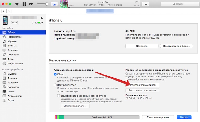 1. Подключите iOS-девайс к iTunes и создайте резервную копию.