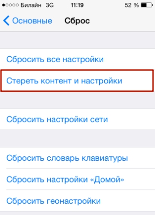 Шаг 3 . Выполните полный сброс устройства. Для этого нужно зайти в «Настройки » Айфона, проследовать по пути «Основные » — «Сброс », в последнем подразделе найти пункт «Стереть контент и настройки » и кликнуть на него.