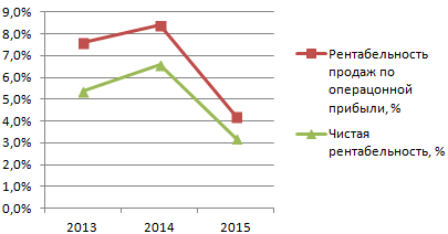 В 2015 году показатель значительно снижается, что расценивается как неблагоприятное явления. Необходим дополнительный анализ ассортиментного перечня, ценообразования и системы контроля затрат.