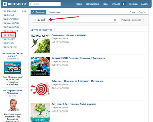 Заходите в группу, в поисковую строчку вбиваете основное слово и переходите в любое понравившееся вам сообщество.