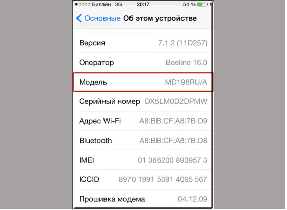 Бывают случаи, когда вам не показывают коробку, но имеется возможность рассмотреть айфон. Следует зайти в настройки, а затем отыскать пункт «Основные». В открывшемся окне нужно перейти к разделу «Об устройстве». Напротив поля «Модель» будет написан код.