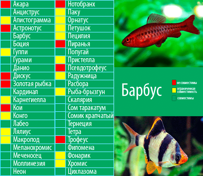 По темпераменту рыбы могут быть от природы очень агрессивными. Это относится ко всем цихловым. Нельзя совмещать их с мирными рыбками, обладающими скромными размерами. Барбусы откусывают плавники сожителям, в связи с этим нежелательно их соседство с вуалевыми рыбками, которые привлекают внимание своими ярко выраженными плавниками и хвостом.