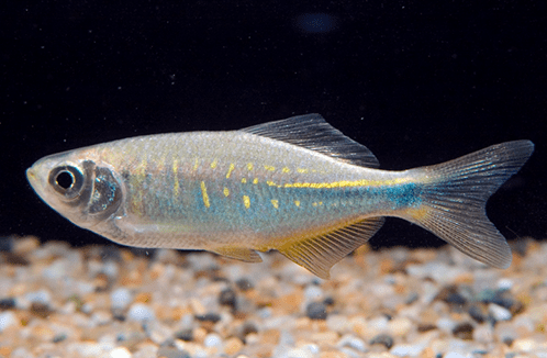 Данио точечный – по окрасу верхней части тела напоминает данио рерио: те же темные полосы на светлом фоне. Нижняя же часть тела и анальный плавник покрыты не полосками, а темными точками. На хвостовом плавнике тоже темные полосы. Длина рыбки не больше 4 см. Самец меньше самки, брюшко его белое, у самки – оранжевое. Вид мирный. Для этого вида температура воды не должна быть ниже 24 ⁰С.