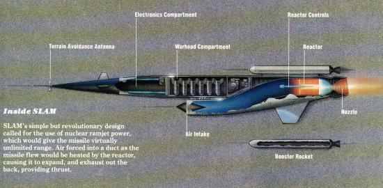 До сих пор неизвестно, кто, где и как планировал проводить испытания исчадия ада. И кто бы отвечал, если бы SLAM сбилась с курса и пролетела над Лос-Анджелесом. Одно из безумных предложений предлагало привязать ракету за трос и гонять по кругу над безлюдными районами шт. Невада. Однако сразу возникал другой вопрос: что делать с ракетой, когда в реакторе выгорят последние остатки топлива? К месту, где “приземлится” SLAM, будет нельзя приближаться в течение столетий.