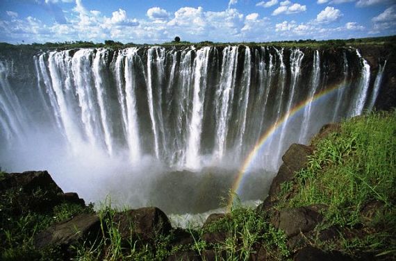 Водопад Виктория в Южной Африке можно отнести к самой важной и красивой достопримечательности всего континента. С местного языка название переводится как что-то вроде «Гремящий Дым». Оно появилось из-за огромного занавеса из мелких водяных частиц, которые растягиваются примерно на 2 км. Максимальный поток воды в секунду – 5 млн. литров.