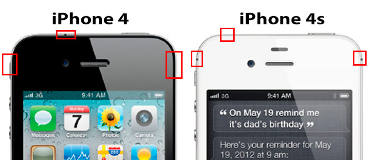 У iPhone 4s она на левой и правой гранях в верхней части, у 4S – возле разъема для наушников.