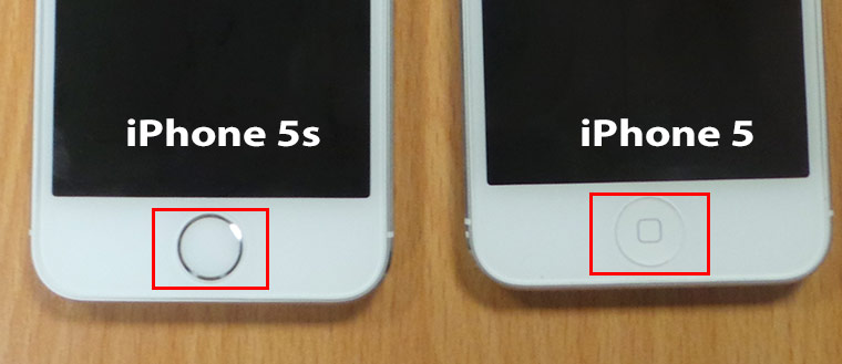 У iPhone 5s есть сенсор TouchID и отсутствует характерный белый квадратик.