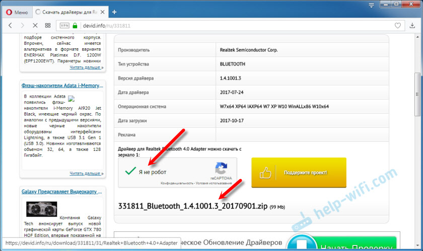 Проходим проверку "Я не робот", нажимаем на ссылку и сохраняем архив с драйвером.
