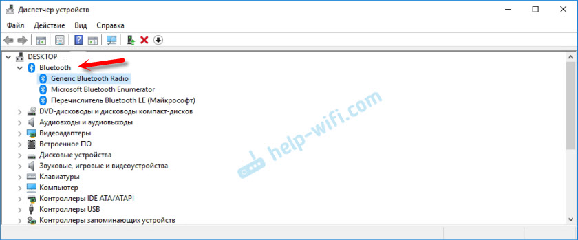 Прежде всего, вам нужно проверить наличие блютуз-адаптера на своем ноутбуке. Это можно узнать из документов на ваше устройство. Также можно посмотреть на заднюю крышку вашего ноутбука. Если в вашем ноутбуке есть адаптер блютуз, то скорей всего на задней крышке будет соответствующий значок. Или же просто зайти в диспетчер устройств вашего компьютера. Если в вашем ноутбуке есть адаптер блютуз, то в диспетчере устройств он будет указан. Выглядеть это будет примерно так.