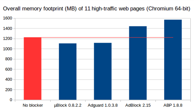 : относительно молодое, но очень перспективное расширение для блокировки рекламы на сайте. Основным преимуществом uBlock перед Adguard , Adblock и Adblock Plus его авторы называют очень низкую нагрузку на процессор и потребление памяти для работы плагина. Для наглядности, сравнение в потребление памяти