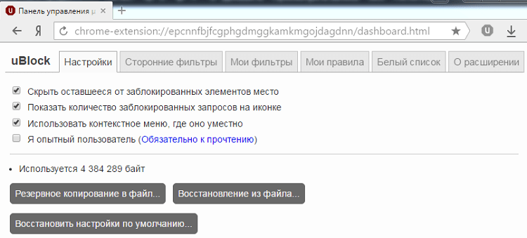 uBlock очень схож с Adblock и Adblock Plus — тот же белый список, список используемых фильтров, возможность добавить свои. Имеется возможность импорта и экспорта настроек, так что вы легко сможете перенести все ваши настройки на другую машину и не потеряете их при переустановке операционной системы.