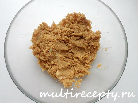 - Смешайте крошку с растопленным сливочным маслом. Полученное «тесто» выложите в форму или чашу мультиварки, застеленную бумагой, разравнивая и тщательно придавливая его сверху руками, чтобы корж был монолитным.
