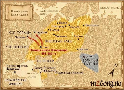 Но уже в это время Владимир приступил к решению крупных государственных задач. В первую очередь он восстановил вновь единство Русской земли, потому что во время его междоусобной войны радимичи и вятичи отказались подчиняться Киеву. Три года потребовалось Владимиру, чтобы снова включить их в состав Руси.