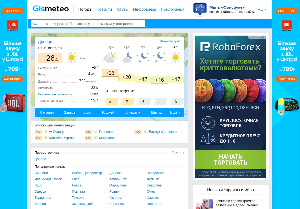Российский ресурс, который занимается прогнозированием погоды на ближайшие несколько дней. На главной странице портала указаны основные страны и их столицы, в которых можно узнать прогнозирование погоды и сведения об изменениях погоды в определенное время.