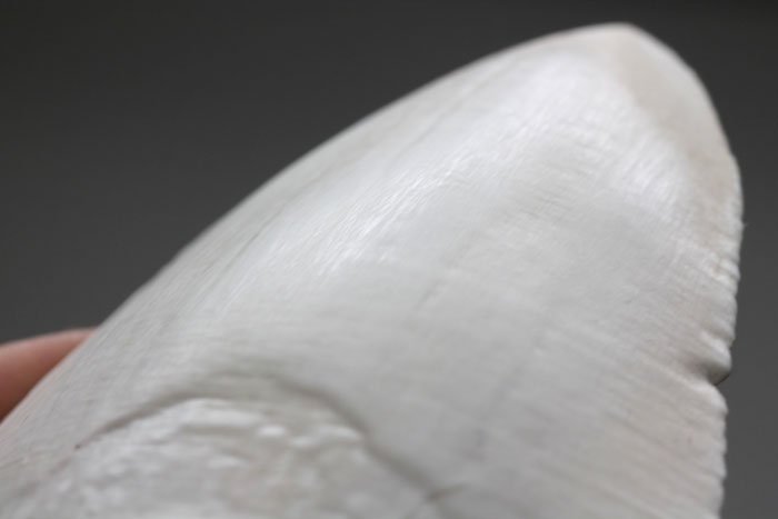 Фотография была сделана с макросъемкой, глубина резкость мала, но выделен основной фокус для того чтобы увидеть детали. Средняя часть зуба была подвергнута полировке. Результаты оказались очень хорошими. Для сравнения обратите внимание на левую сторону, где видно следы печати.