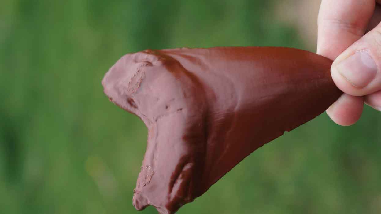 Данный акулий зуб был напечатан на Makerbot Replicator 2 коричневым PLA пластиком, а затем его обработали тетрагидрофураном и высушили.