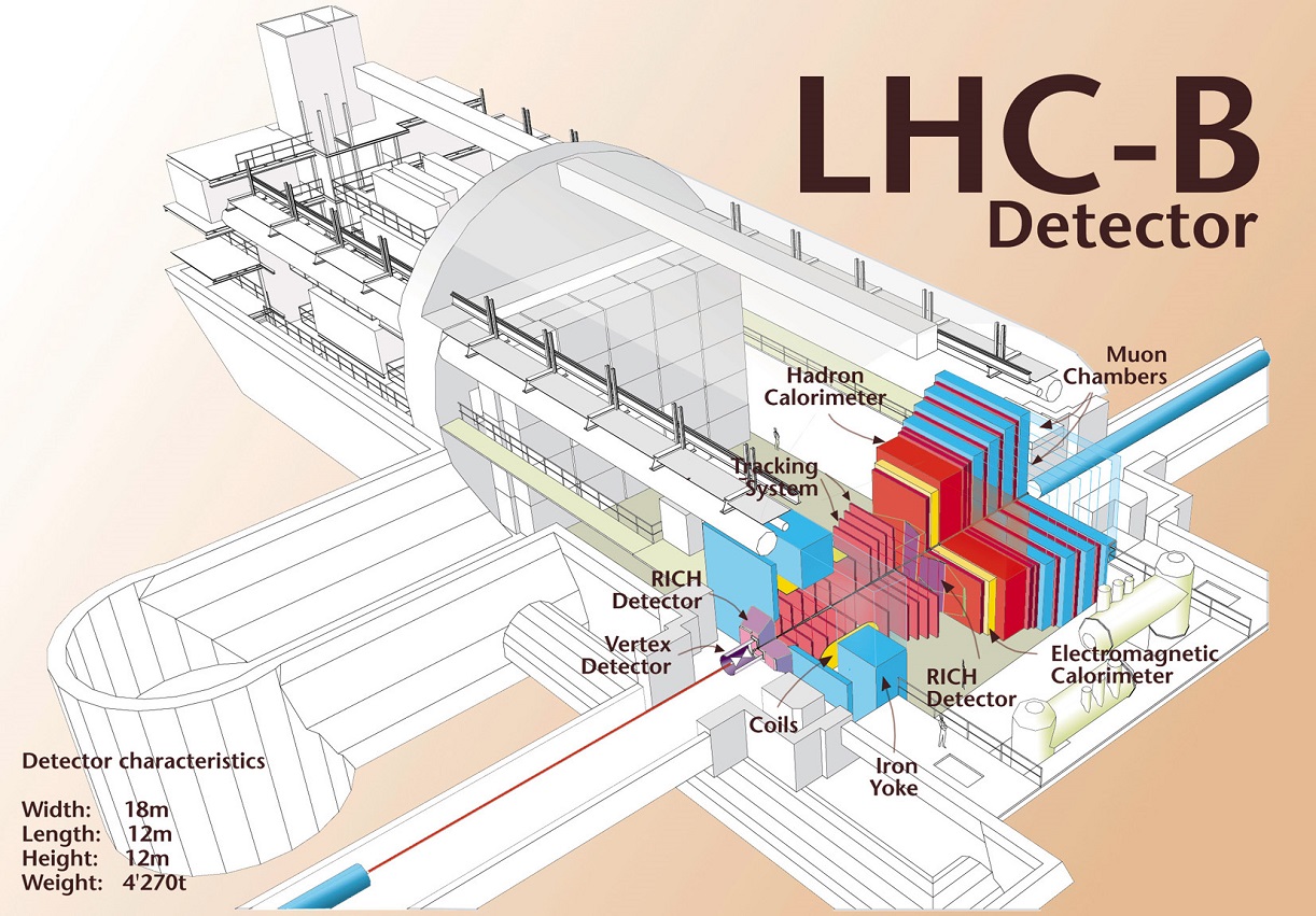 5600-тонный детектор LHCb состоит из прямого спектрометра и плоских детекторов. Это 21 метр в длину, 10 метров в высоту и 13 метров в ширину, он находится на глубине 100 метров под землей. Около 700 ученых из 66 различных институтов и университетов вовлечены в эксперимент LHCb (октябрь 2013 г.).
