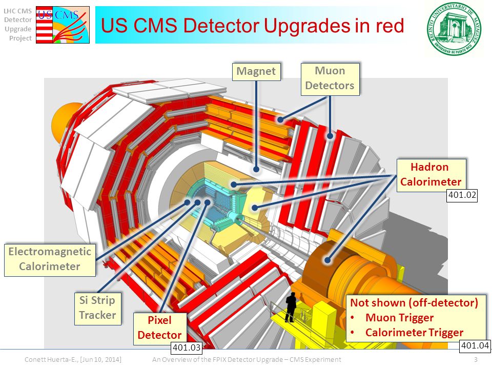 - Кремниевый трекер — состоит из 75 миллионов отдельных электронных датчиков, расположенных в концентрических слоях. Когда заряженная частица пролетает через слои трекера, она передает часть энергии каждому слою, объединение этих точек столкновения частицы с различными слоями позволяет в дальнейшем определить ее траекторию.