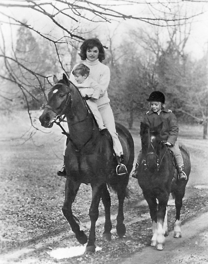 7. Жаклин с детьми Кэролин (справа) и Джоном-младшим едут верхом в их домовладении Глен Ора 25 ноября 1962 года. (Photo credit AFP/Getty Images)