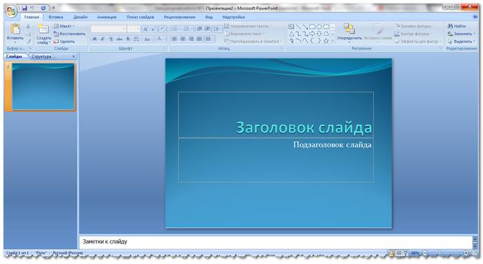 Левая панель отображает все слайды, из которых состоит презентация. Они могут быть в виде своих миниатюрных копий, а могут отображаться структурированным текстом, отображая заголовки или содержание слайда. Также в этой панели можно перемещать и менять местами расположение слайдов. На области задач (она находится справа) будут отображаться действия, которые можно использовать в процессе создания показа. Внизу экрана есть область Заметок, где можно вписывать все комментарии к создаваемому слайду, которые видно только в процессе работы над презентацией.