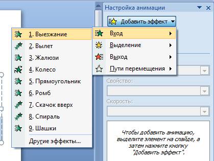 Тогда появится с правой стороны панель, где можно каждому объекту добавить отдельный эффект, а также настроить его скорость, звуковое сопровождение и время появления.