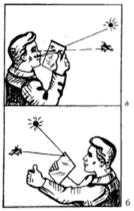 Простейшее сигнальное зеркало можно изготовить из металлической пластины, отполировав ее с двух сторон. Дальность обнаружения сигнала будет зависеть от степени полировки поверхностей. В центре пластины надо сделать отверстие диаметром 5 — 7 мм. Через отверстие пластины надо наблюдать за появившимся самолетом (рис. 157).