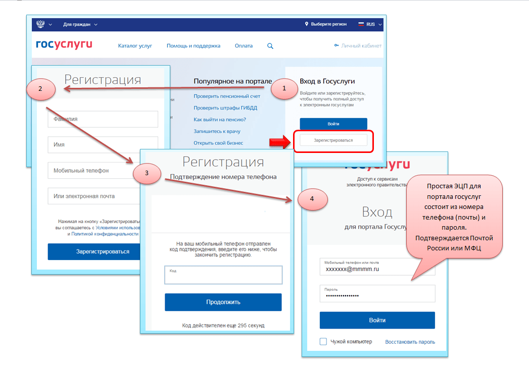 Для того чтобы создать простую ЭЦП, необходимо зайти на главную страницу портала госуслуг, найти в правой части окошко «Вход в госуслуги» и нажать на кнопку «Зарегистрироваться» (как показано на рисунке ниже). Далее вводим свою фамилию, имя, номер телефона (или почты) и регистрируемся. На указанный номер телефона (или на адрес почтового ящика) придет подтверждающий код (или ссылка). Вводим полученный код (или переходим по присланной ссылке) и нажимаем кнопку «Подтвердить». Указываем личный пароль, который будет применяться при дальнейшем входе на госуслуги.
