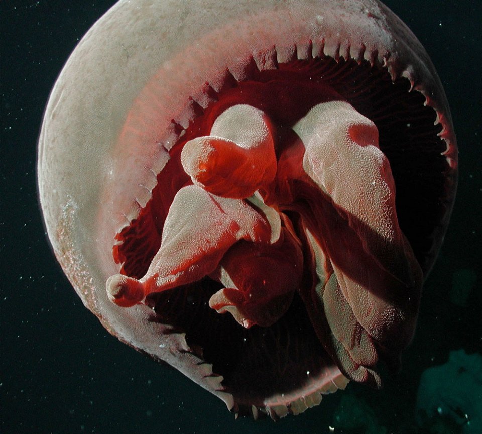 Эта поразительно большая медуза может вырасти в длину более чем на один метр и имеет отличительную красную окраску. Вместо щупалец глубоководная морская медуза использует серию мясистых “рук”, чтобы заполучить свою добычу.