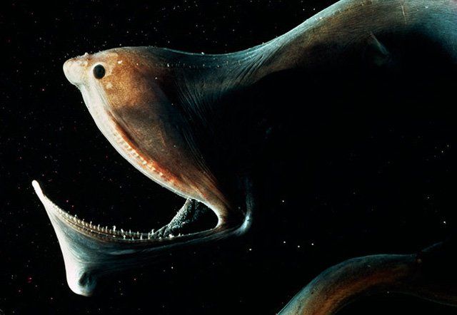 Угорь с головой пеликана. Встретить это существо можно на глубине около одной тысячи метров, длина его туловища достигает двух метров. Большерот - вероятно, одно из самых странно выглядящих глубоководных созданий, скрывающихся в глубинах океана. С огромным ртом, пеликан способен к глотанию вещей, намного больших, чем его собственный размер.